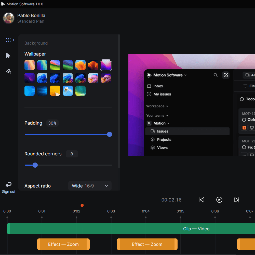 Motion captures your display in high-resolution, and tracks your cursor to automatically create a stunning animation.